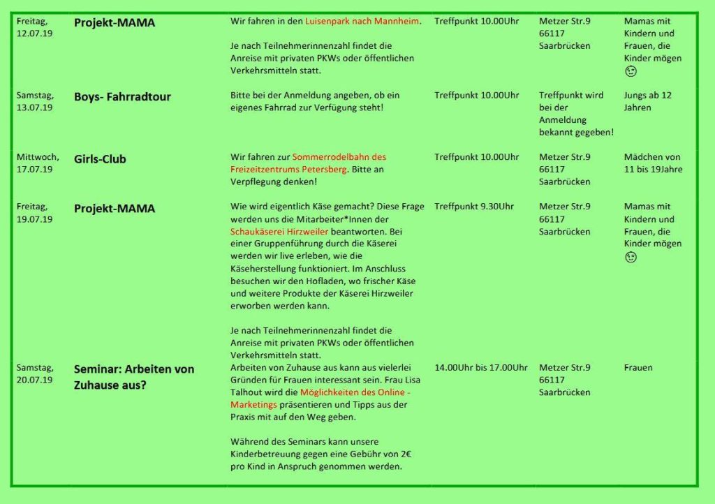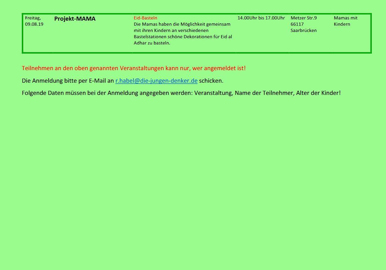 Folgende Daten müssen bei der Anmeldung angegeben werden: Veranstaltung, Name der Teilnehmer, Alter der Kinder!